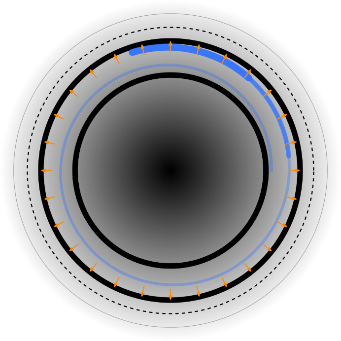 - Concentric gradient / contour rings: a concentric light-to-dark gradient and fine dashed contour rings represent the axisymmetric pull of the far field - the steady outward appearance of mass - with no fixed dipolar bias.